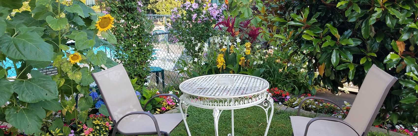 What started as a few flower beds of common plants has slowly grown over the years. Bored with the traditional offerings at garden centers, I’ve added and expanded gardens to contain an ever growing collection of plants. About 90% of the gardens consist of annuals and will be different every year– a feature many returning guests have come to enjoy.
